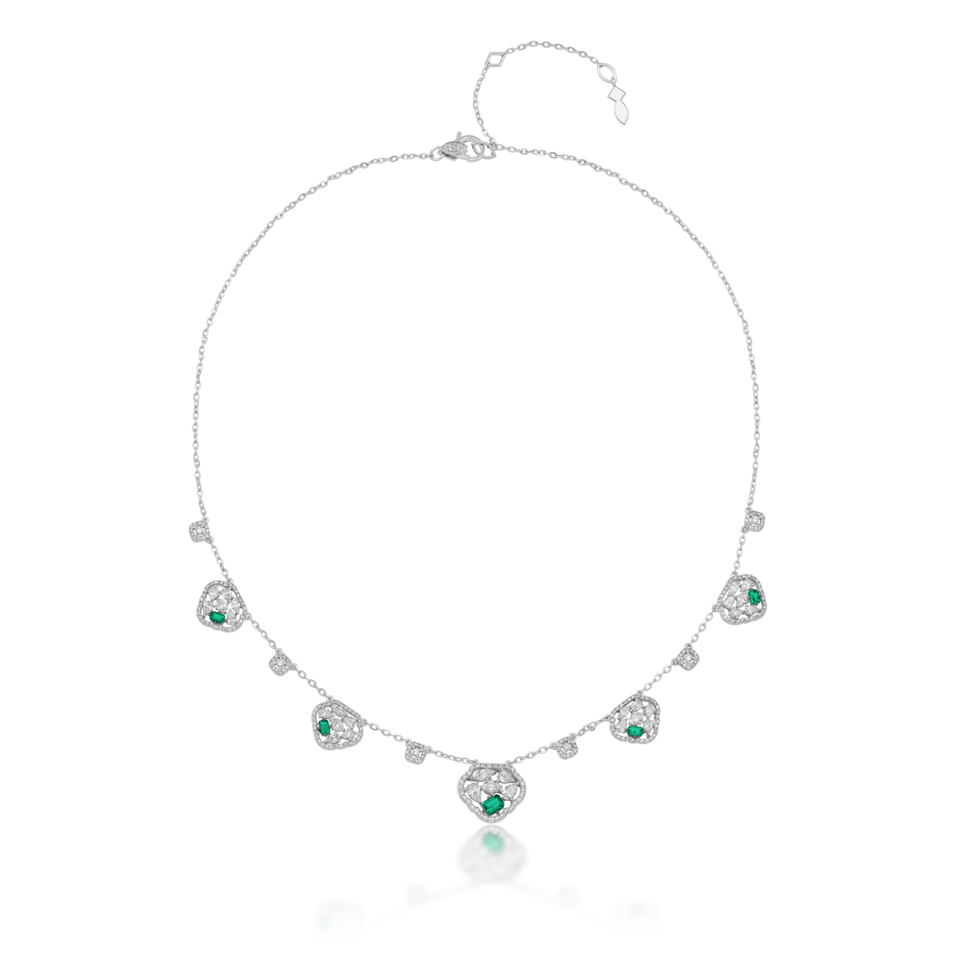 Echoing the intricacy of a mosaic, the Diversa Emerald Glow Necklace is a celebration of individuality. Crafted in 18K white-gold, this necklace brings together pear, oval, round, and marquise-cut diamonds, their brilliance enhanced by pavé-set diamonds. At the center, a geometric emerald stands out, symbolizing the individual voice within the collective. The interplay of shapes and shades reflects the beauty of different expressions coming together to create something extraordinary.