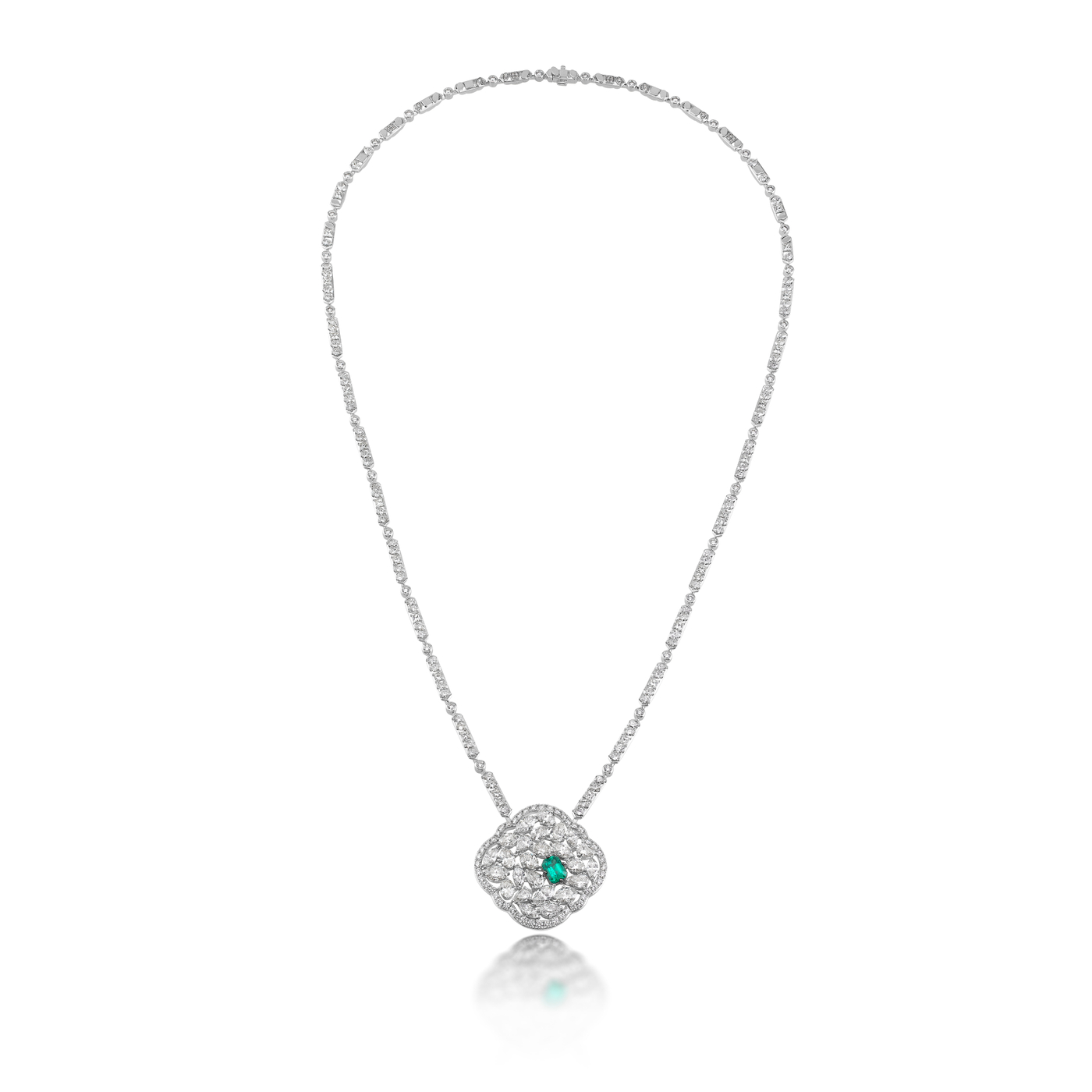 Radiating with asymmetrical grace, the Diversa Spotlight Medallion Pendant is a celebration of individuality within a multifaceted world. Like a mosaic brought to life in precious stones, this pendant brings together marquise, oval, round, pear, and princess-cut white diamonds, beautifully framed by pavé-set diamonds. Amid varied diamond cuts in unique arrangements, a single geometric emerald stands out, symbolizing the individual voice within the collective. Crafted in 18K white-gold, the interplay of shapes and shades reflects the beauty of different expressions coming together to create something extraordinary.