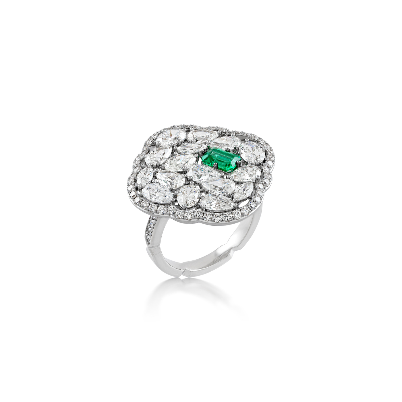 Radiating with asymmetrical grace, the Diversa Spotlight Ring is a celebration of individuality within a multifaceted world. Like a mosaic brought to life in precious stones, this ring brings together marquise, oval, round, and pear-cut diamonds, beautifully framed by pavé-set diamonds. Amid varied diamond cuts in unique arrangements, a single geometric emerald stands out, symbolizing the individual voice within the collective. Crafted in 18K white-gold, the interplay of shapes and shades reflects the beauty of different expressions coming together to create something extraordinary.