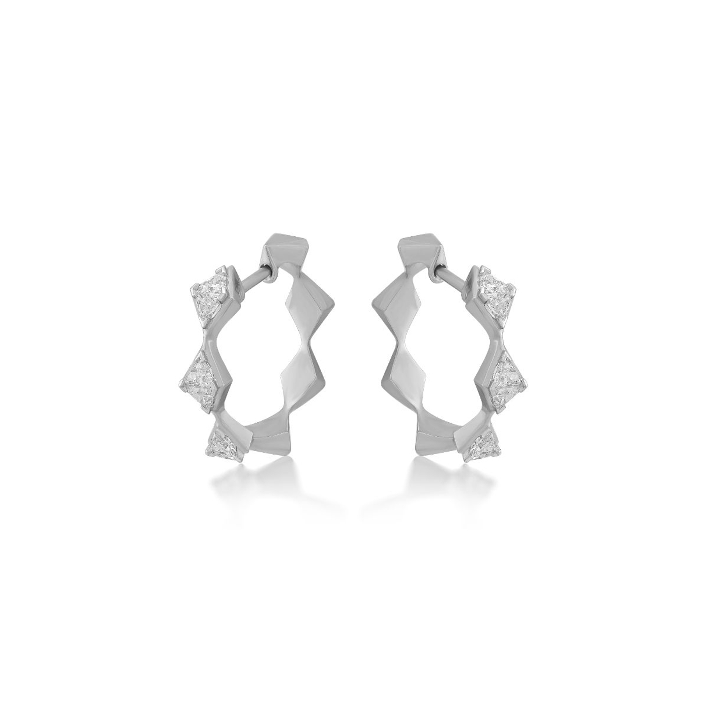 Radiating with sharp brilliance and sculptural precision, the Limitless Elevate Earrings celebrate ambition and vision through the forms and lines of Art Deco architecture. Crafted in 18K recycled gold, these earrings showcase a geometric three-dimensional design with trillion-cut faceted diamonds set like consecutive pyramids on a hoop. Explore the Limitless necklaces, bracelets, and rings to complete the look.