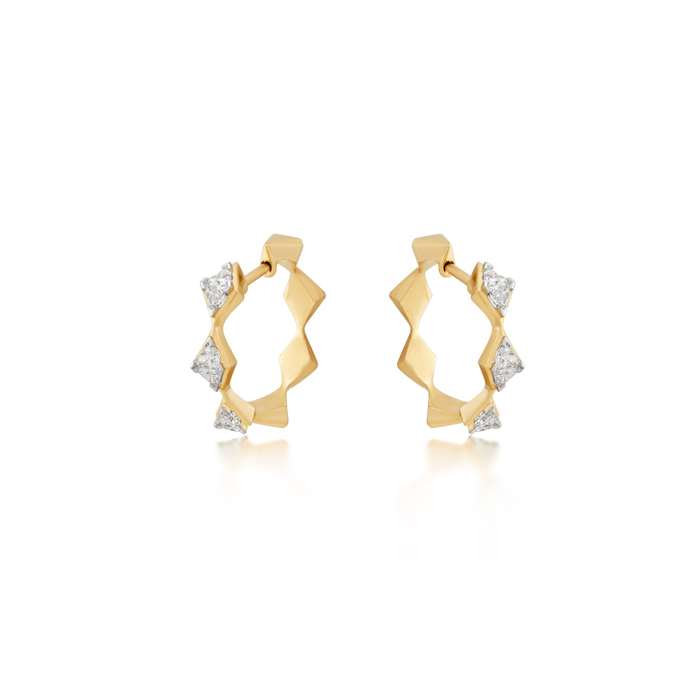 Radiating with sharp brilliance and sculptural precision, the Limitless Elevate Earrings celebrate ambition and vision through the forms and lines of Art Deco architecture. Crafted in 18K recycled gold, these earrings showcase a geometric three-dimensional design with trillion-cut faceted diamonds set like consecutive pyramids on a hoop. Explore the Limitless necklaces, bracelets, and rings to complete the look.