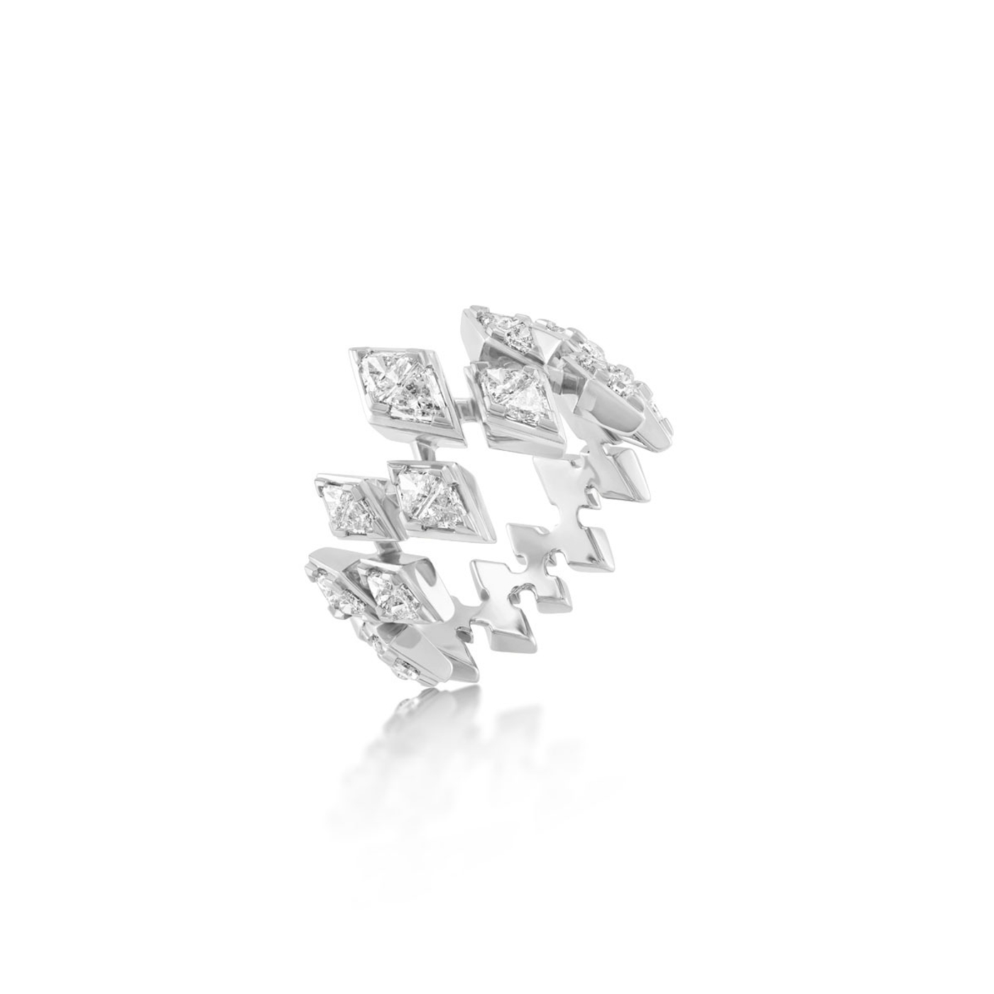 Radiating with a sharp brilliance and sculptural precision, the Limitless Pinnacle Ring celebrates ambition and vision through the forms and lines of Art Deco architecture. Crafted in 18K recycled gold, this design showcases a geometric three-dimensional design with trillion-cut faceted diamonds set like pyramids in a dynamic arrangement, sweeping around the finger in a bold statement. A masterpiece on its own, this ring band can be paired with additional rings from the collection. The Limitless earrings, necklaces, and bracelets complete the look.