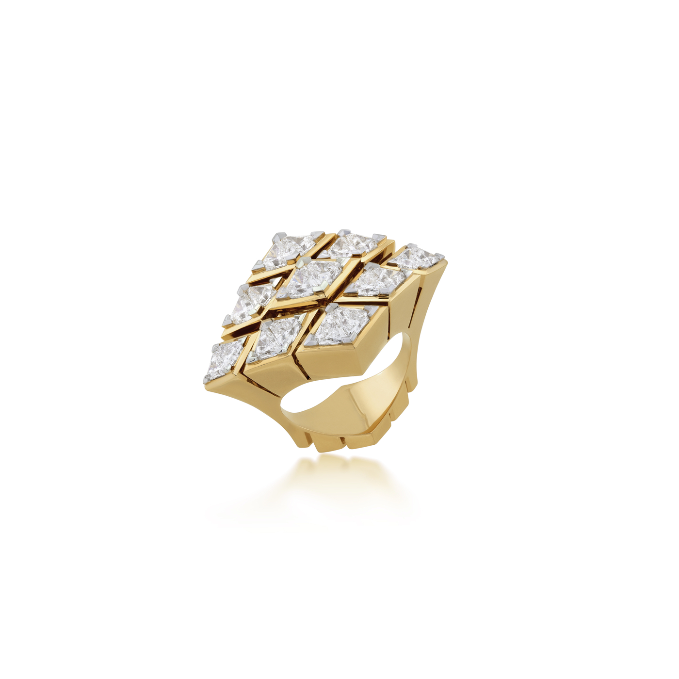 Statement ring featuring trillion-cut diamonds in pyramid shapes.