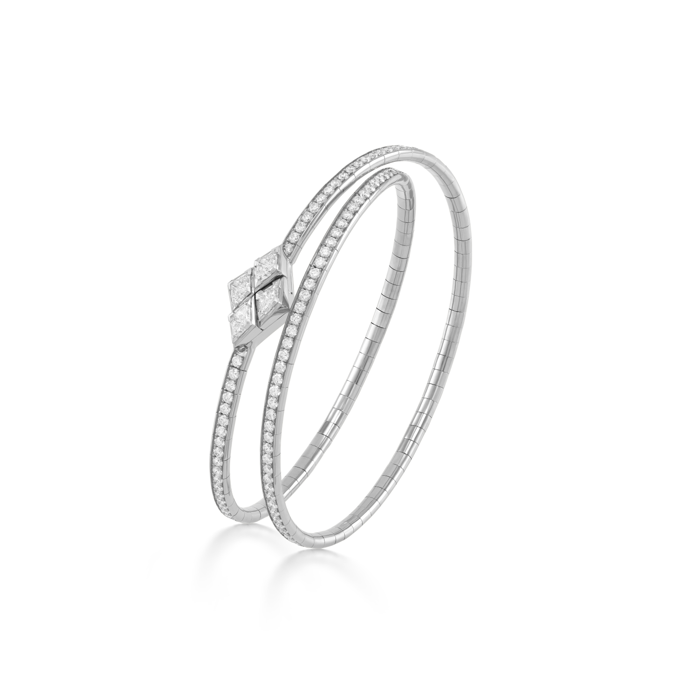 Intertwined bangle showcasing trillion-cut faceted diamonds and round pavé diamonds.