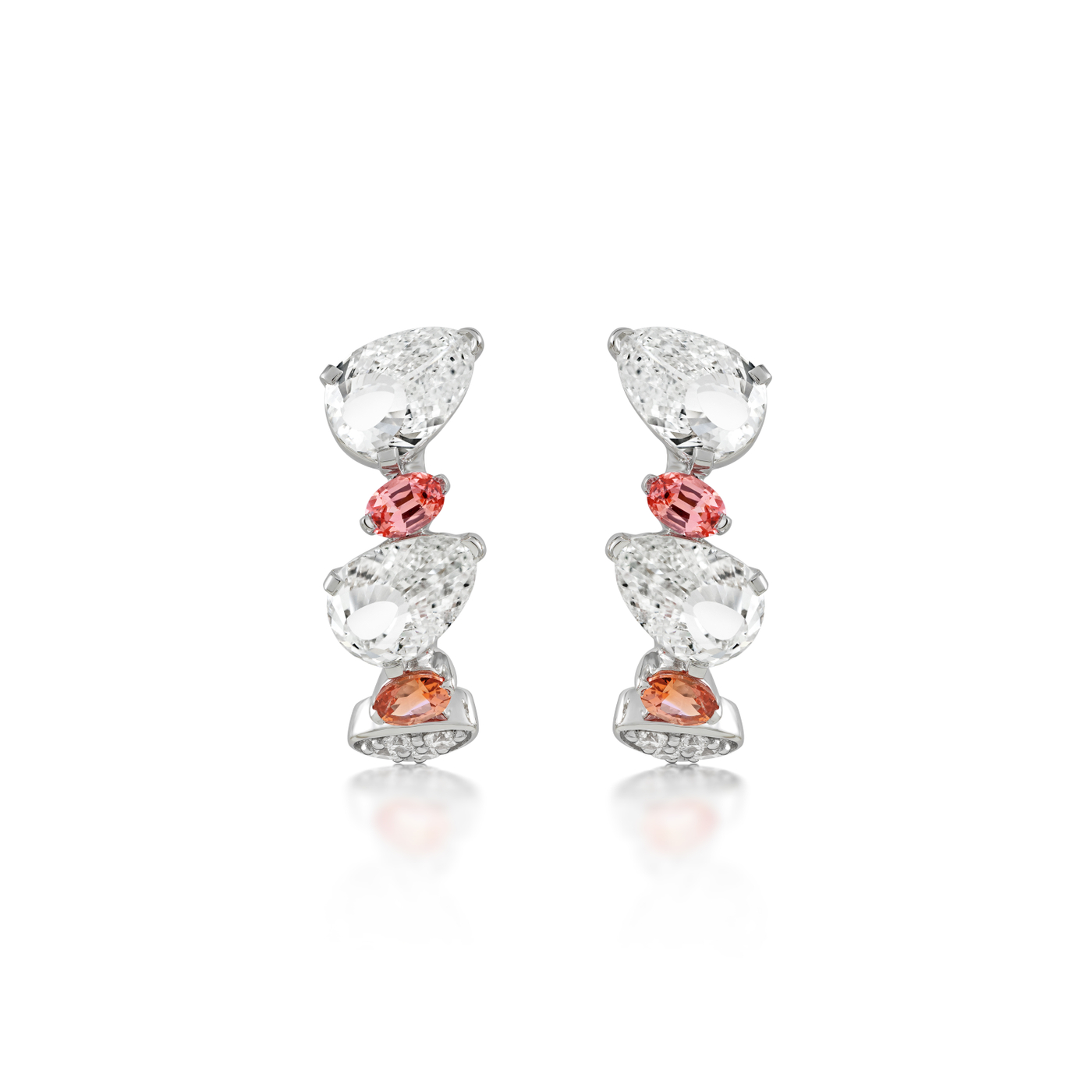 Embodying the beauty of self-expression, the Plume Soar Blush Earrings showcase an alternating pattern of Peacock-cut diamonds and pink Padparadscha sapphires in angular formations that evoke the dynamic movement of a peacock’s wings. Each Peacock-cut diamond is crafted with 27 upward-facing facets that evoke the strands of a plume, while the Padparadscha sapphires glow with pink-orange hues that shift with every movement, revealing new depths of color from each angle. Set in 18K recycled gold, these earrings capture the journey towards confidence and inner worth.