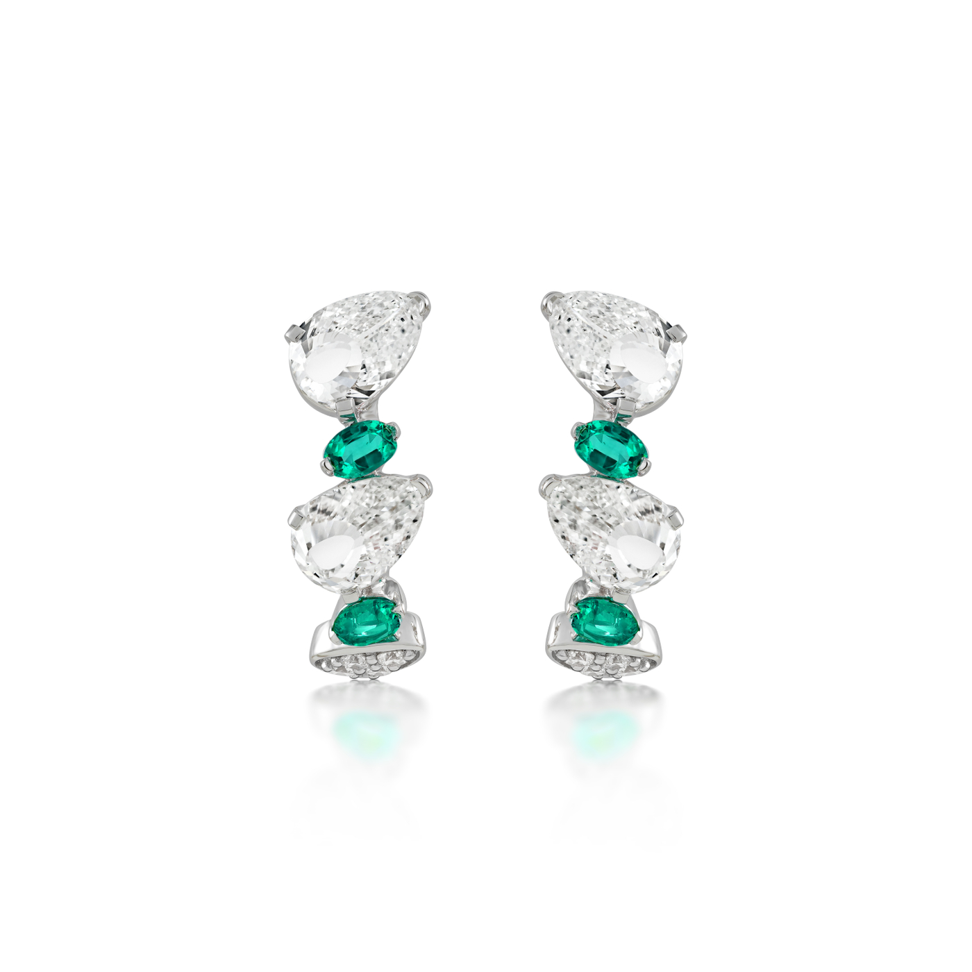 Embodying the beauty of self-expression, the Plume Soar Emerald Earrings showcase alternating Peacock-cut diamonds and green emeralds in angular formations that evoke the dynamic movement of a peacock’s wings. Each Peacock-cut diamond is crafted with 27 upward-facing facets that evoke the strands of a plume. Set in 18K recycled gold, these earrings capture the journey towards confidence and inner worth.
