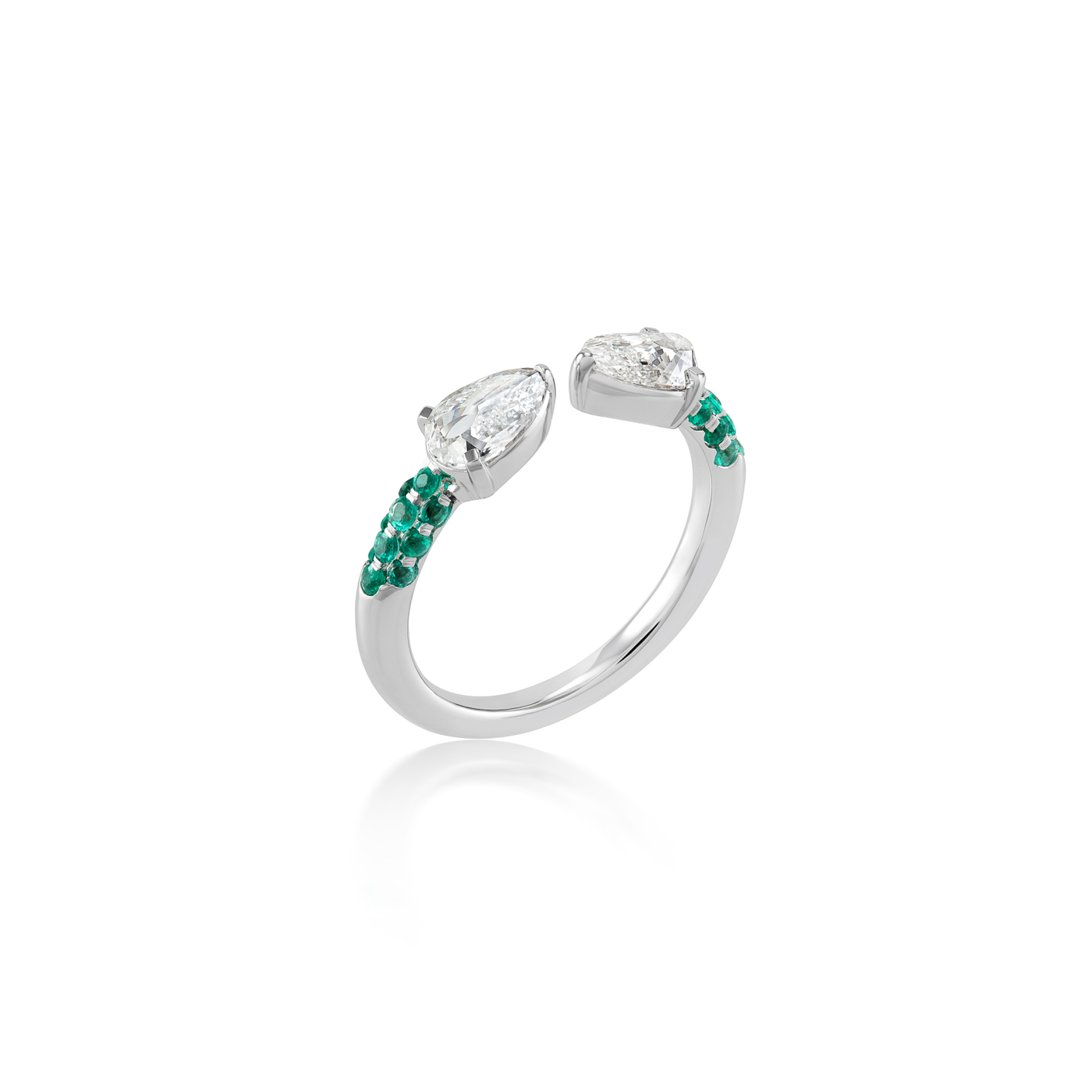 An elegant ring showcasing Peacock-cut diamonds and green emeralds set in 18K recycled gold.
