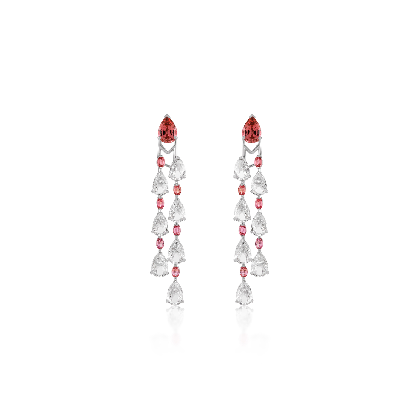 The Plume Glide Blush Drop Earrings reveal a dynamic interplay of light and color through cascading rows of Peacock-cut diamonds and padparadscha sapphires in varying hues, anchored by dark pink spinel. Each Peacock-cut diamond is crafted with 57 upward-facing facets that evoke the strands of a plume. Set in 18K recycled gold, these earrings capture the journey towards confidence and inner worth.