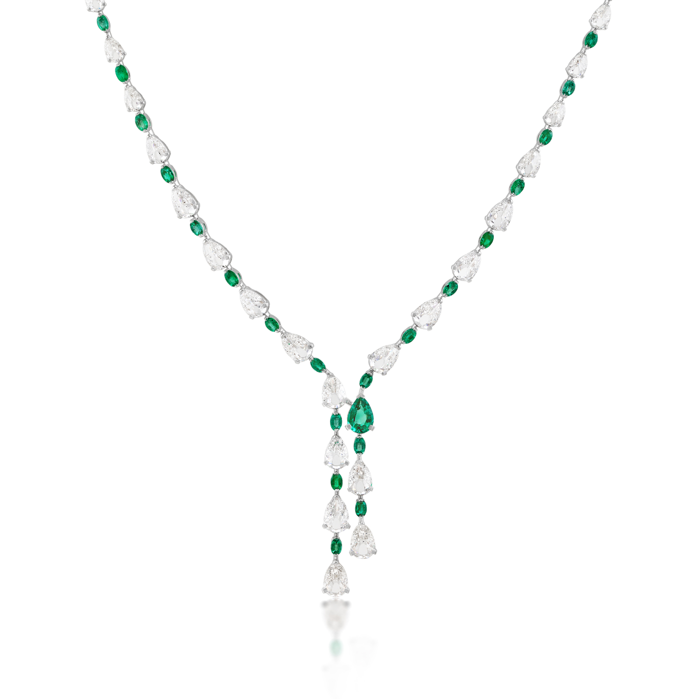 The Plume Glide Emerald Necklace reveals a dynamic interplay of light and color through a cascading arrangement of Peacock-cut diamonds and green emeralds in varying hues, creating a rich visual rhythm. Each Peacock-cut diamond is crafted with 27 upward-facing facets that evoke the strands of a plume. Set in 18K recycled gold, this necklace captures the journey towards confidence and inner worth.