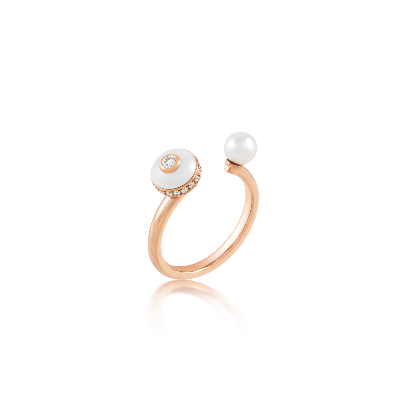 The Poetry in Motion Blanche Open Stackable Ring captures the spirit of passion in a design that feels both timeless and contemporary. Set in 18K recycled rose-gold, its open silhouette showcases ghungroo-inspired elements that move gracefully with the wearer, with soft, musical sounds. The jewel is crafted with white ceramic and round diamonds, offset by Japanese Akoya pearls, for a minimalist allure.