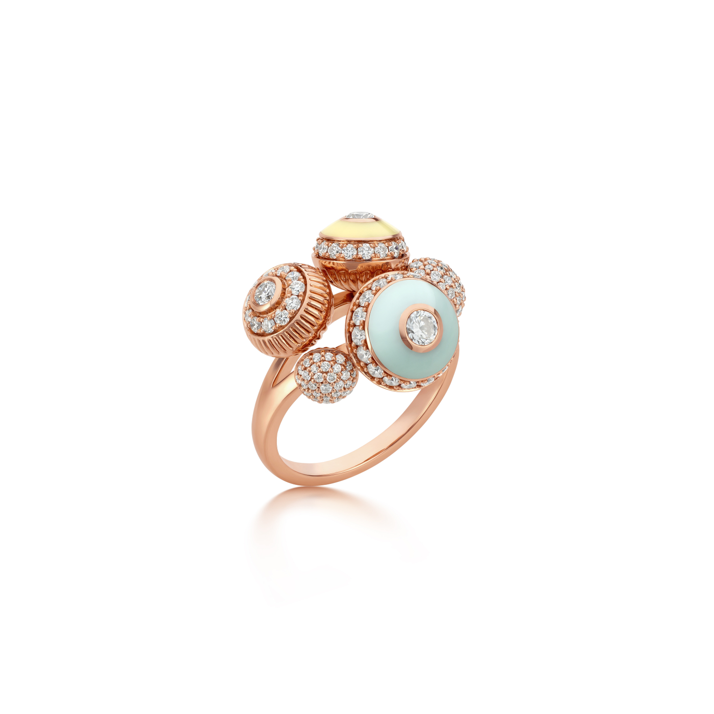 Cluster ring showcasing round diamonds with yellow and green enamel, set in 18K rose-gold.