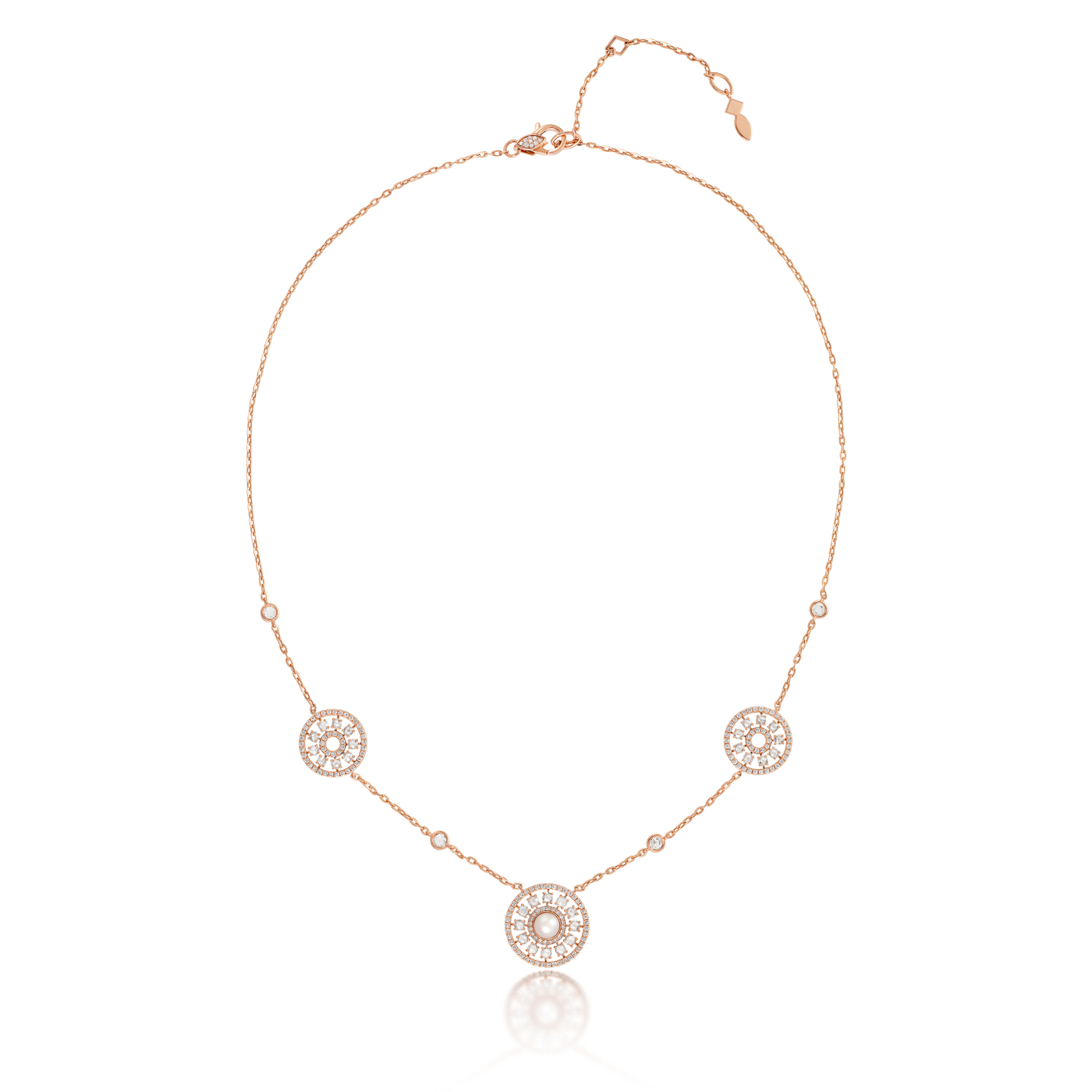 A play of light and texture defines the Sero Affinity Trio Necklace. Crafted in 18K rose-gold, this necklace showcases three discs with exquisite Japanese Akoya pearls encircled by round rose-cut diamonds along with pavé-set diamonds. A new ‘invisible’ linking technique was developed for the collection, inspired by Chikankari shadow work, allowing rose-cut diamonds to appear as though they delicately float over the skin. With its refined craftsmanship and subtle fluidity, the jewel reflects the beauty of connections that are strengthened in subtle, unseen ways.