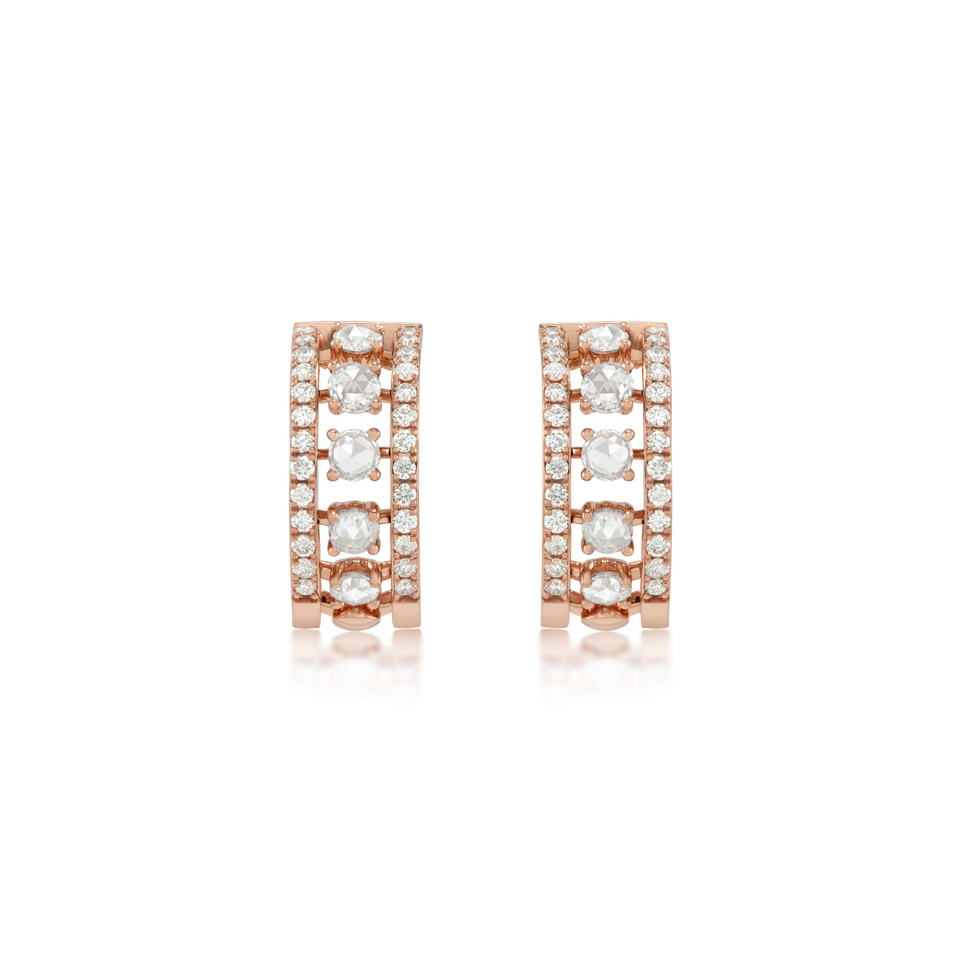 A play of light and texture defines the Sero Slim Diamond Earrings, meticulously crafted in 18K rose-gold. With a graceful form and delicate movement, these 18K rose-gold earrings showcase round and oval rose-cut diamonds, complemented by pavé-set diamonds. A new ‘invisible’ linking technique was developed for the collection, inspired by Chikankari shadow work, allowing rose-cut diamonds to appear as though they delicately float over the skin. With its refined craftsmanship and subtle fluidity, the jewel reflects the beauty of connections that are strengthened in subtle, unseen ways.